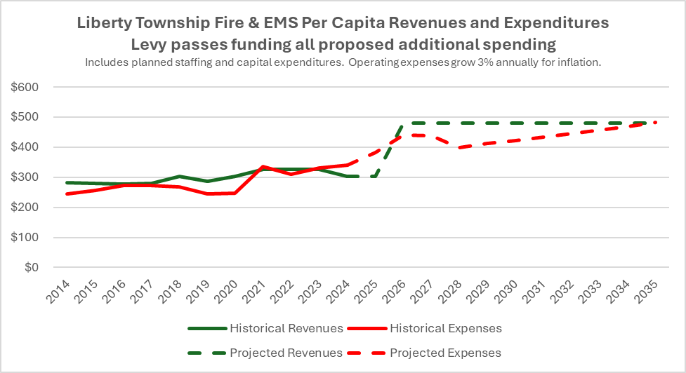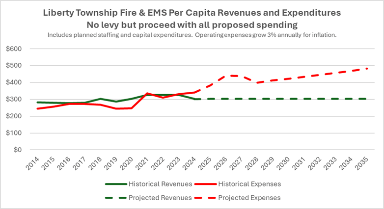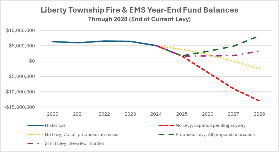Ultimately, the proposed levy provides a secure and sustainable path for Liberty Township Fire & EMS. While a hypothetical 2-mill levy (again, this is NOT a choice on the ballot) keeps the fund balance positive, it doesn’t offer the stability needed for long-term planning and growth. And without any levy, we risk more substantial shortfalls in just a few short years.